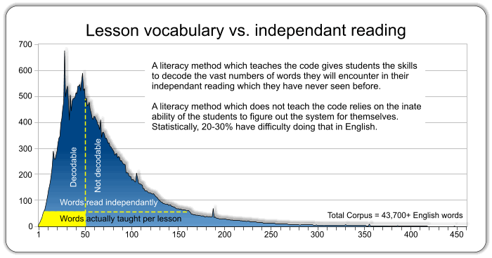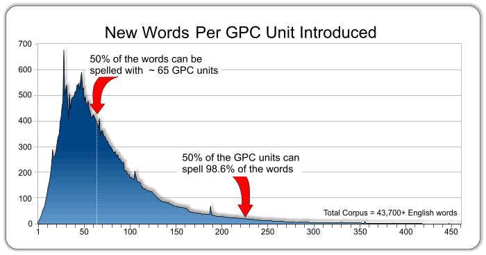 The chart below illustrates how many words become available in English if you would introduce the most productive spelling pattern at each step. Each time you introduce a new letter or spelling pattern you increase the number of words that can be spelled and pronounced with the patterns you have at your disposal. Notice the tremendous increase in vocabulary that becomes decodable early in the sequence.