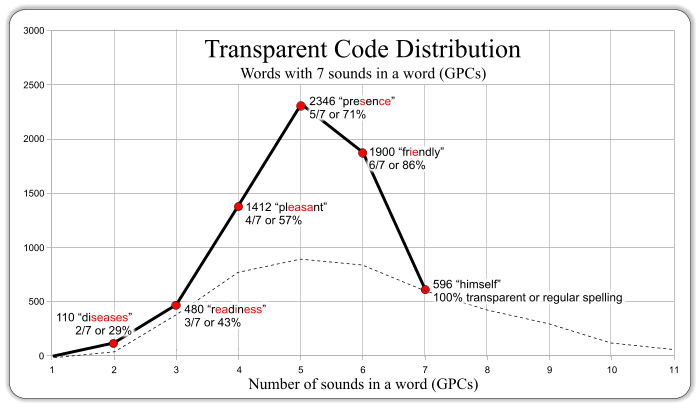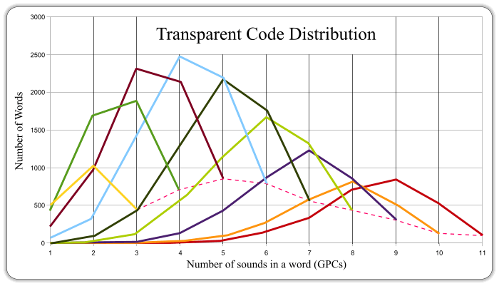 The next chart below maps out the same analysis for words with different number of sounds. Each line refers to words with a certain number of sounds. The height of the lines indicates the number of words containing a certain number of regular spelling patterns.